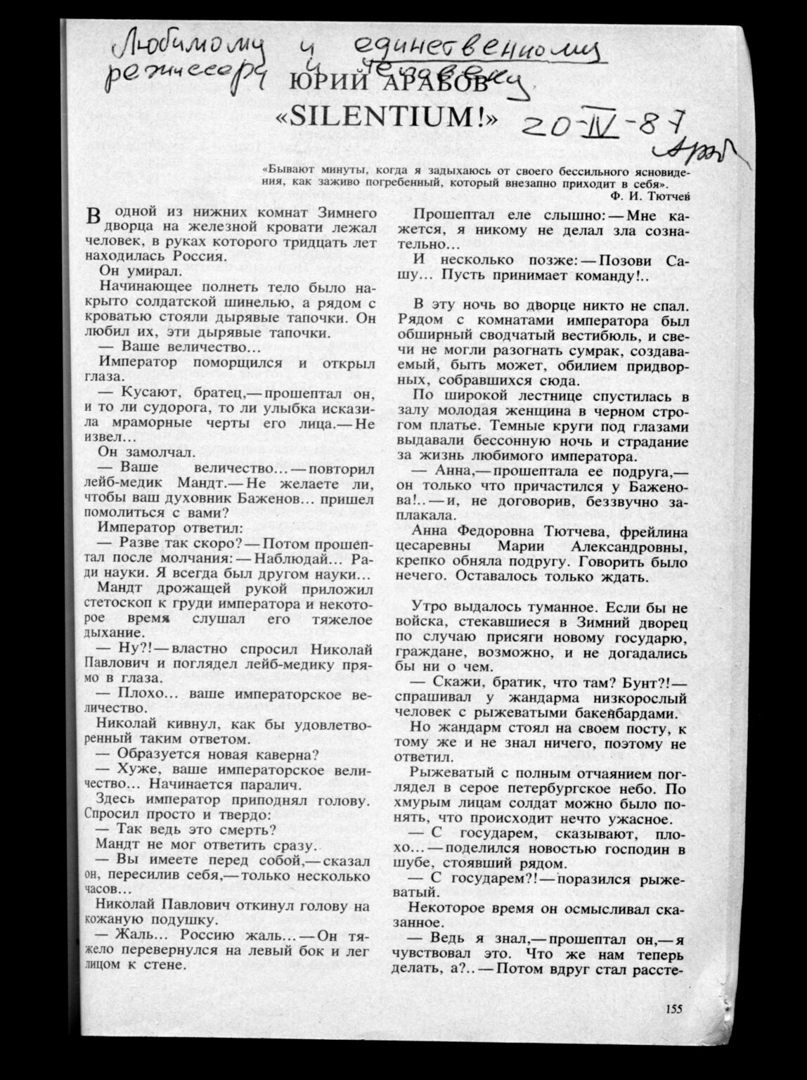 «Любимому и единственному режиссёру и человеку». Автограф Юрия Арабова на первой странице сценария к фильму «Тютчев», опубликованном в журнале «Литературно-художественный альманах». 1987. Из архива Александра Сокурова