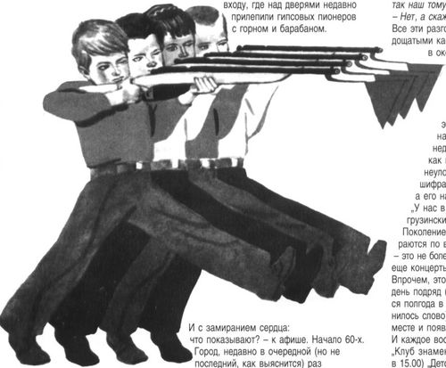 В принципе, только теперь до меня начинает доходить, почему предпочтение наше так решительно отдавалось фильмам из «другой» жизни. Все то, что в нашей собственной повседневной жизни категорически запрещалось, признавалось предосудительным, недопустимым, там, на экране, оказывалось безусловным достоинством. Драться, например, не подчиняться взрослым (разумеется, «вредным», а с хорошими взрослыми -.правильными — быть не просто заодно, но — наравне). И хулиганить там тоже позволялось, Вот когда царя, кажется, встречали, Микопка-парозов залез на чердак, вытащил рогатку, одному — бац! — тухлым яйцом в глаз, в трубу дохлую ворону — раз! Труба как завоет! Потом вообще, когда Семку-матроса убило, за пулемет залег — и по немцам: тра-та-та-та-та! Семка в последний раз глаза открыл: «Воюешь, сынок?» — «Воюю». И дальше из пулемета кроет. А попробуй кто-нибудь из нас такое сейчас школе устроить?! … Сразу — на линейку пионерскую потянут, галстук снимут, а то еще и из школы попрут, как пацанов из 20-й школы, когда они козу к двери класса привязали. Как в «Добро пожаловать! …» или «Друг мой, Колька». Тоже про современность, но хорошее кино. Добро пожаловать даже с титрами, совсем как в старых картинах.