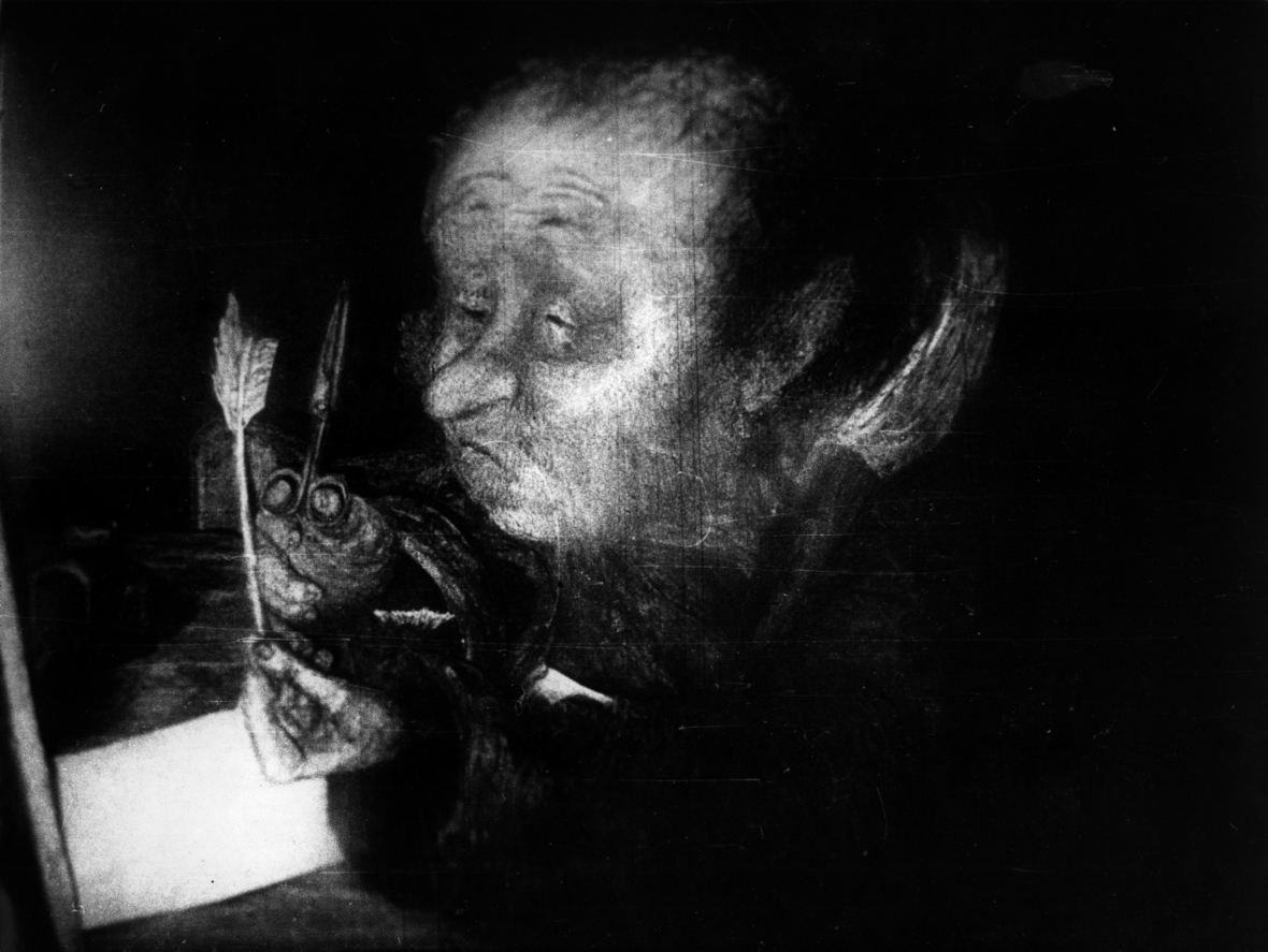 Среди букв он пребывал как бы в некоем неземном мире. Когда я делал эпизод «Акакий Акакиевич в комнате», у меня было желание, чтобы к нему в комнату вошли буквы. Буквы, которые он особенно любит. И он их встречает... Ну, как, знаете, к мальчику на день рождения пришли взрослые красивые тети и дяди, которых он никогда не видел. Вот они пришли и принесли ему подарки, а он просто стоит и смотрит на них: неземные существа, божества. Вот и с буквами то же. Они пришли к нему, и он с ними так же себя ведет — в восхищении смотрит на них. А как только заходит хозяйка, все исчезает. Она застает его в совершенно нелепом положении. Он весь там, в неземном мире, а тут вдруг хозяйка. Все, фантазия кончилась. Все это было навеяно пушкинской строкой: «И тут ко мне идет незримый рой гостей, знакомцы давние, плоды мечты моей...» А, собственно, так оно и есть. «И забываю мир. И в сладкой тишине я сладко усыплен моим воображеньем. И пробуждается поэзия во мне...». Всё! Он поэт, Акакий Акакиевич!.. Но потом я от этого отказался. Дело в том, что в департаменте у него будет такой дивертисмент с буквами. Там будет и буква любимая, и буква, к которой он равнодушен. Та, к которой он равнодушен, естественно, будет ревновать его к букве, которая любимая, и между ними будет перепалка. Акакий Акакиевич между ними оказывается в ситуации, так сказать, «суда Париса»: кому отдать предпочтение. Как вы понимаете, все это абсолютно находится в сердцевине мультипликации.