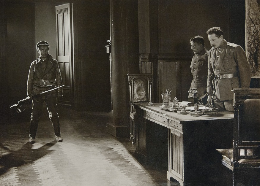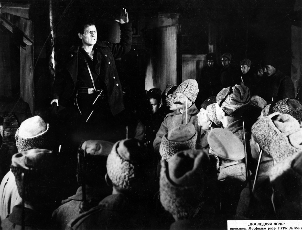 Московское восстание Райзмана, большей частью скрытое в темноте, проступает рисунком переплетенных частных судеб. Московское восстание Барнета, взято, естественно, на общем плане, однако стоит вырезать обстоятельные титры и пару-тройку казенных мизансцен, и понять, кто здесь «свой», а кто «чужой», будет едва ли не сложнее, чем несчастному рабочему-гимназисту, то ли Кузьме, то ли Арнольду, подстреленному в «Последней ночи» на полдороге к своим от чужих (а так хотелось, чтобы чужие были своими). Один из ключевых эпизодов Барнета — набор в белую и красную гвардии. Они, конечно, не одинаковы. На белых камера смотрит сверху вниз и прижимает их к пустой стене. На красных — снизу вверх, соблюдая почтительную дистанцию от гигантских теней, поддерживающих их фигуры. Не более, однако. Ни язвительности, ни уничижительности: ну, девицы, ну, юноши, тронутые декадансом, ну, студенты, шляпки вот, опять же, изящные. У красных, ясное дело, лица все больше рабочие и усатые. Но о грядущей красной победе или, скажем, погубившей белых духовной развращенности (которой у Райзмана будет куда больше), или о еще каких правоверных фактах эти групповые портреты не говорят решительно ничего. Вереницы идущих на смерть людей тонут во тьме. Финал выглядит почти пародийно: красногвардеец, в дыму и угаре, орет: «выбран совет народных комиссаров, товарищи» — как гласит титр. А вокруг всё уже окончательно пошло вразнос: взрывы, крушения, дымы и опять бегущие куда-то люди. К финалу пришит еще, впрочем, Ленин (рабочий Никандров с бородкой), видимо, объяснить-таки ребятам, за что стреляли и куда бежали.