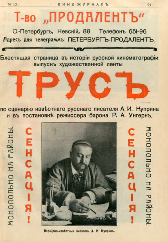 В «Биржевых ведомостях» напечатано следующее письмо А. Куприна: «ЗА последнее время мне часто приходится видеть в „Огоньке“, „Биржевых ведомостях“ и других изданиях объявления и рецензии о кинематографической пьесе „Трус“ сочинения А. Куприна. Должен сказать, что я в этой пьесе не причем. Мною было дано одному знакомому право передать мой рассказ „Трус“ для кинематографа в его собственную пользу, что он и исполнил. Потом либретто его было переделано и дополнено дирекцией театра. А теперь, пробегая краткий конспект пьесы, я вижу, что в ней моего почти не осталось ничего, кроме заглавия и моей фамилии. Мне равно неприятно как возлагать на себя чужие лавры, так и отвечать за чужое безвкусие. Но из простой деликатности дирекция театра могла бы в анонсы вставлять: „по пьесе такого-то — переделано и улучшено таким-то“».