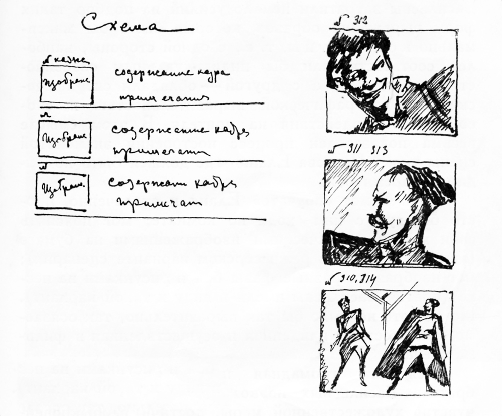 После того началась основная, отличная от обычных методов, работа художника. Совместно с режиссерами и оператором производилась раскадровка всего действия. Каждый кадр будущего фильма в последовательном порядке рисовался художником и обсуждался оператором и постановщиками, сделавшими тоже немало эскизов. Таким образом, все 820 кадров картины были изображены художником (три кадра мы здесь воспроизводим), каждый из них был снабжен порядковым номером, текстом сценария, характеристиками и примечаниями.