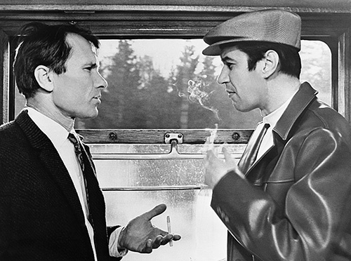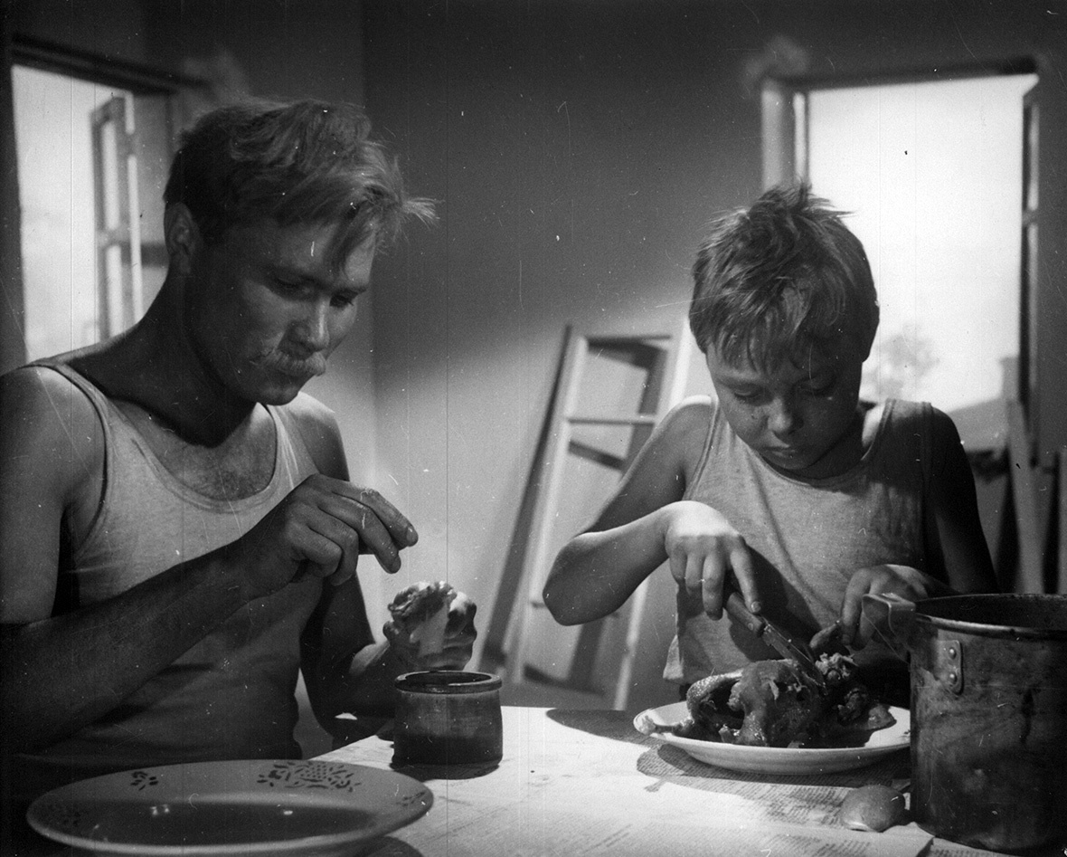 Раздражение сопровождало его по жизни — в редкие ее часы и годы Шукшин казался ненадолго освободившимся от груза нетерпимости. Попав главным героем в картину Марлена Хуциева и Петра Тодоровского «Два Федора» (1958), Шукшин лучшими эпизодами сделал возвращение с фронта. Не лирическую историю возвращения и любви, а именно путь «оттуда», снятый в темной, ночной гамме момент прощания с «малым» Федором. Уходящий состав с солдатами, набитыми в грузовые вагоны, для большого Федора, докуривающего на перроне папиросу, был последней попыткой избавиться от сиротства — личного и народного. На нарастающей скорости поезда он рванулся к Федору малому, прижал его к себе и вскочил с дорогой ношей в последний вагон. Объятия стали в нашем кинематографе образом «победы со слезами на глазах». Фильм — сверстник послевоенного кино о войне: «Баллада о солдате», «Летят журавли», «Судьба человека»… Мрачный молчун Шукшина — из того же времени оплакивания, скорби, немоты, подчас мученической. Федор Шукшина (с высветленными волосами — первый и последний блондин в его кинобиографии) руками, кладущими кирпичи, трудом на руинах войны пытался возродить смысл бытия и душу. Светлая дорога в будущее в фильме перекрывает темный туннель войны Федора-большого. Не так просто было в жизни самого Шукшина.
