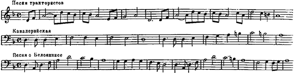Некоторая структурная «одноликость» мелодий особенно проявляется в массовых песнях А. Пахмутовой. В этих песнях немало ярких, свежих интонаций, но всё же в них заметна чрезмерная приверженность к одному, пусть даже удачно найденному, приёму. Например, мелодии таких различных по содержанию песен, как «Баллада о Белояннисе», «Кавалерийская» и «Тракторист» (из лирической комедии В. Шатуновского «Противная сторона»), поначалу развиваются почти одинаково. Их динамика основана на движении чёткого, рельефного мотива от тоники к минорной доминанте: