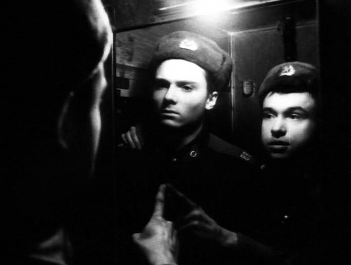 Вряд ли кто из нас выделил бы из толпы на гражданке этого субтильного, с малодушным, сипло-хрипловатым голосом подростка, смазливого, с бегающими глазками, не без артистизма. Здесь Мазур (А. Полуян) пригодился очень кстати, дожидаясь полутора лет, чтобы вот так, без видимой силы, обаяния и ума стать повелителем. Он мгновенно просекает в Иверене скрытую мятежность и всячески пытается, актерствуя, ее подогреть на удовольствие личному составу. Именно он, думаю, режиссер всех изобретательных измывательств над новобранцами, передающихся по наследству из одного призыва в другой — вроде отдачи чести на корточках до полного изнеможения. Он своего рода утонченная натура и потому получает наслаждение от бессилия ненависти, все больше и больше овладевающей Иверенем. Из купе змеевидно вылезает Мазур, он еще слова не вымолвил, но поле намагничено тревогой, чем-то постыдным, унизительным.