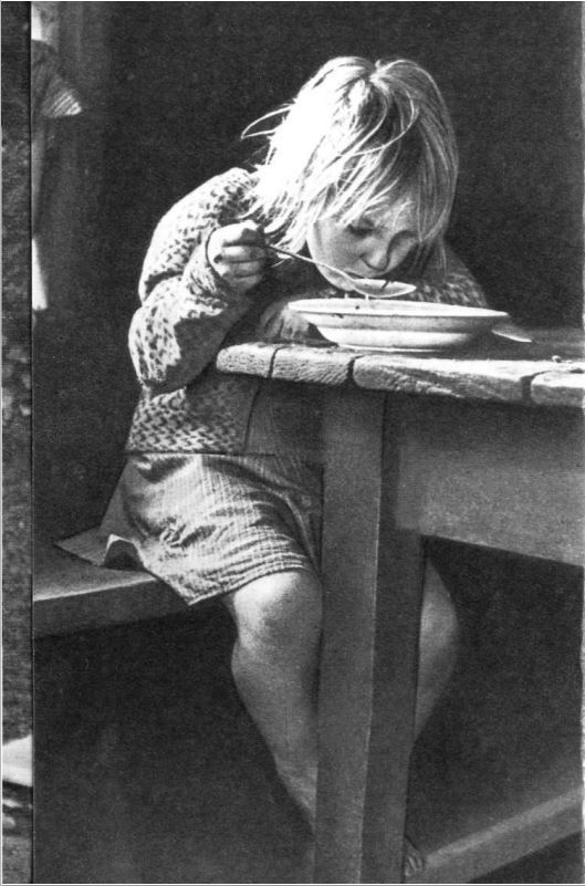 Будучи на уборке урожая, я зашел в дом напиться. Хозяйка подала глиняную кружку, черпак, и тут прибежала ее дочка, босая, растрепанная (я видел, как она носилась на лугу) и, конечно, проголодавшаяся. Когда мать налила ей тарелку супа, она стала быстро есть, потому что во дворе ее ждала подружка (она видна на краю кадра). Все было обычным для деревенского быта, меня привлек лишь колорит: раскрасневшееся личико девочки, соломенные волосы на зеленоватом фоне стены.