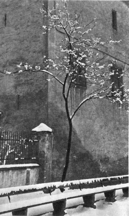 Сыро. Холодно. Одинокое деревце у мокрой стены. Иллюзия цветения... Образ у меня возник от мягких хлопьев первого снега. Подует ветер — иллюзия исчезнет. Какие ассоциации будит эта картина? Воспоминания о минувшей весне? Ощущение новой? Или просто радость гармонии и красоты наперекор грязной, неуютной стене?.. Я не могу дать объяснение, что это такое. И люди, видевшие снимок (он был когда-то на выставке), говорили разное, созвучное их настроению.