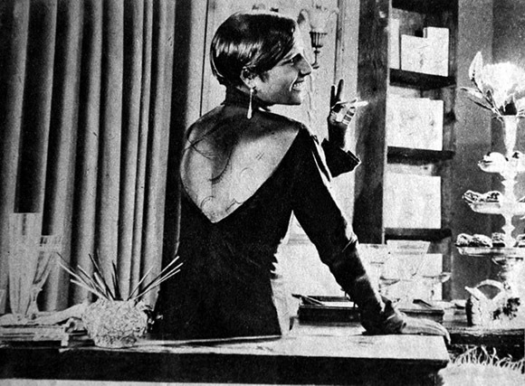 Использование бархата, как основного фона (нет ни потолка, ни пола, ни стен) помогло бы заняться вплотную изучением кино-игры, света и линии и отойти от обычных кино-заимствований у театра (хотя бы и самого левого), избегнув в то же время «стилизации».