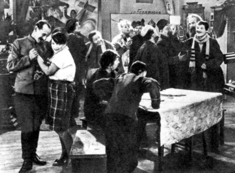 Тов. Гюне из яч‹ейки› ОДСК при Таганском кинотеатре: ‹…› Здесь товарищ говорил, что некоторые места сделаны лубочно; я считаю, что это неверно, лубочность показана как раз в меру, так как эти места носят сатирический характер. Очень ярко выставлены моменты обывательской жизни с их сплетнями и мещанством. У каждого зрителя возникают вопросы, присматриваясь к этой картине, чисто бытового характера. Ведь среди нашей молодежи найдется немало таких легкомысленных и недалеких мещан, которые еще много должны сделать, чтобы искоренить у себя эти недостатки. Кроме того, здесь мы видим сопоставление быта здорового и быта гнилого, чуждого нам и устаревшего. ‹…›