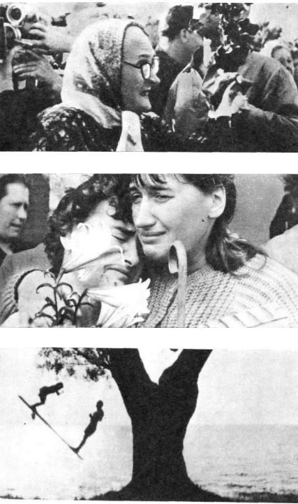 Волнений было, конечно, немало, и материала хватило бы на отдельный фильм. Режиссер укладывает это событие в три минуты. Как же он этогс добивается? Он берет только высшие точки — самые первые, наиболее драматические минуты встреч на аэродроме и самые последние секунды перед разлукой, вот-вот уже надо идти к трапу. А двухнедельное пребываение на родине заменяет в фильме голосами и запахом родной земли — медленной панорамой по ромашковому лугу и многотысячному хору. Песня то пробивается сквозь шум моторов в аэропорту, то заглушается им. И через весь эпизод режиссер параллельно монтирует старуху с розами в скрюченных пальцах, которая ищет в толпе того, кого не видела много лет, но так и не находит его... Острый монтаж определил и характер комментария.