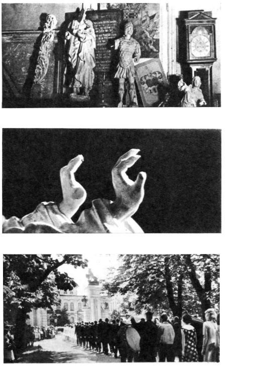 И звуки-призраки... будто лопнула часовая пружина, будто «вздохнул» иссохший деревянный футляр. Затем, панорамируя по высокому креслу, камера (читай — Время), как бы шутя, наносит спесивому прошлому удар — на месте графа на сиденье «разлегся» пылесос, а на него, словно из полутьмы, «глядят» безглазые бюсты царедворцев, деревянные лики святых. В следующем кадре крупно дана деталь скульптуры: руки, поднятые для благословения. И сразу — синхронно с громовым раскатом — кинокамера резким движением вправо словно отбрасывает руки на левый край кадра, придав им тем самым характер защитного жеста. Прошлое как бы отступает под натиском Времени, потому что в следующем кадре мы уже видим праздничную процессию — впереди оркестр, за ним девушки в белых платьях и парни в черных костюмах.