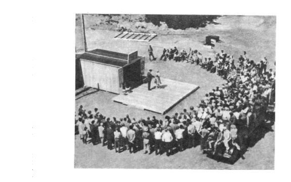 Разумеется, такая предусмотрительность никак не нарушала ни принципов документальности, ни естественного течения жизни. Даже наоборот. Заботясь о лучшем освещении, мы тем самым заботились и об удобствах зрителей. - Для театрального помоста нашлось великолепное место — у белой стены лабораторного корпуса. Если небо будет безоблачным (и, следовательно, свет особенно резким), огромная стена сможет служить естественным рефлектором, смягчающим тени и излишнюю контрастность на лицах. Словом, и тут все складывалось удачно. Ко дню съемки в нашем «уравнении» оставалось лишь одно неизвестное — сам концерт: мы не знали его программы. Хотя решающего значения для фильма это не имело, потому что нас интересовали главным образом зрители, все же хотелось заранее предусмотреть, что снимать, а чего не снимать. Концерт будет длиться час, а фильм — всего пятнадцать-двадцать минут. Значит, нужен жесткий отбор. Но с программой удалось познакомиться только тогда, когда артисты уже приехали на стройку, и, естественно, отбор пришлось делать по ходу концерта. Здесь я прерву наш рассказ и сделаю маленькое отступление, в котором хочу поделиться некоторыми соображениями, кажущимися мне очень важными. Когда имеешь дело с событием и хочешь, следуя его естественной драматургии, рассказать о нем образно, тут, мне кажется, работа автора документального фильма приближается к работе кинодраматурга в игровом кино, с той лишь разницей, что в документальном фильме роли как бы пишутся не для тех, кто будет сниматься, а для тех, кто будет снимать, то есть для операторов. Вот почему еще утром, пока плотники сколачивали помост (мы это сняли сразу же), надо было распределить обязанности между кинооператорами, прорепетировать с ними фильм и договориться о системе связи во время съемки.