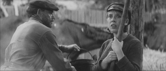 Испытанием веры Жанны начинается, как я уже говорила, следующий фильм (даже одного из судей играет тот самый Евгений Лебедев, который в картине «В огне брода нет» играл белогвардейского офицера). Если белый офицер едва не поверил, глядя в сумрачное и сосредоточенное лицо Тани Теткиной, в крепость ее веры и лишь короткий страх физических мучений ненадолго отделил Теткину от решимости принять за нее смерть, то здесь уже зерно Жанны было заключено все, целиком. Здесь уже была заключена даже характерность темной и бескомпромиссной деревенской святой.