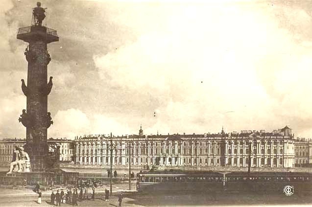 В окнах Эрмитажа — в бледном свете утренней зари — видны очертания площади Урицкого, Нева, силуэт Крепости, Адмиралтейство.