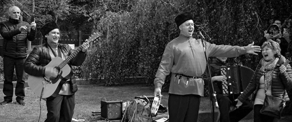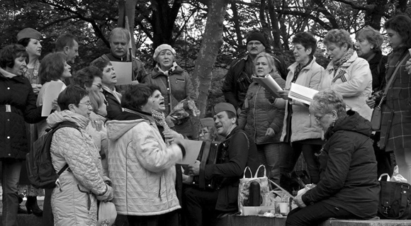 Хоть и оснастили эту массовку иконой Божьей матери, но даже девица, организующая глубоко патриотическую групповую фотку, чувствует: тут что-то не то, какого-то решающего мазка этой картине не хватает. Эврика! Сборище ряженых уместно дополнить фигурой ветерана! И вот: «Ветераны, ау!..» — тщетно взывает она по сторонам, всерьез, видимо, полагая, что былые бойцы, которым вообще-то уже под девяносто, стронутся из всех углов необъятной Родины и на свои кровные рванут с ветерком в Берлин.