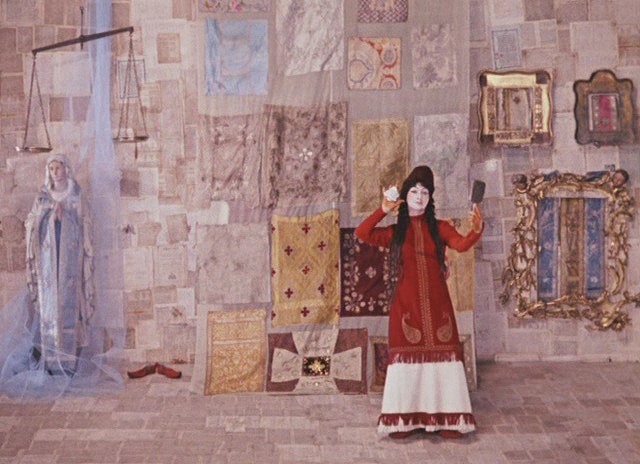Ну, как и что мне удалось реализовать? Во-первых, роль молодого поэта играет Софико Чиаурели — девушка. Она же играет Идеал любви, царевну Анну и все призраки, которые потом появляются в судьбе поэта: монашка в белых кружевах, ангел при вознесении — и пантомимы, это мусульманский театр при дворе царя Ираклия. XVIII век, Армения, Грузия, Азербайджан, Закавказье, царь Грузии, он же царь Армении, придворный поэт — армянин. Видите, все элементы дружбы народов, никакого конфликта между возлюбленными — сестрой царя и поэтом. Просто уход поэта в монастырь от светской жизни, что являлось как бы высшим вознаграждением поэтов и поэзии Ренессанса, Армении средневековья.