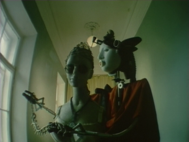 Такая двойственность — зависимость от диктовки Системы и в то же время явная самостоятельность — присутствует и в кадрах, использующих цикличные движения персонажей, напоминающие механические движения машины. Дама, расположившаяся в вольготной позе, читает книгу, механически сгибая и разгибая руку, подвешенную к ручке аппарата. Лежащего на диване Темного человека заставляет отжиматься машина. Персонажи подчиняются диктовке, но в то же время оказываются независимы от нее — в тот момент, который он выбирает сам, герой волен отстегнуть аппарат и удалиться.