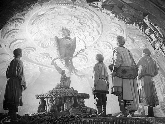 Птушко же говорил басом и держал от своих былинных героев нас, зрителей, на расстоянии вытянутой булавы. В нем не было той гостеприимной, всеядной пестроты «Детского мира», что царил в сказках Роу. К его сокровищницам требовался увесистый эстетический ключ, слишком еще неподъемный для наших малохольных детсадовских ручонок. Он оживлял цвета и композиции палеха в многофигурных широкоформатных планах «Сказки о царе Салтане» (1966) и выписывал титры «Каменного цветка» (1946) на фоне малахита. Он был чужой, этот колдун. Зато у него водились гомункулы, и потому его никак нельзя было пропускать.