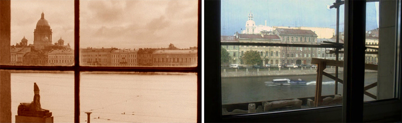 Город в «Трофиме», как кажется поначалу, обозначен лаконично, настолько, насколько это нужно для жанра новеллы — идентифицировать хронотоп и только. Надпись «Санкт-Петербург» на дебаркадере Витебского (Царскосельского) вокзала для фиксации места действия; булыжник, вывески с ятями и ерами, телеги и прохожие в костюмах для «дореволюционности»; трактир и публичный дом обозначают социальный слой. Но как только гармонист в трактире затягивает «Спит гаолян», а случайным собеседником Трофима оказывается морячок, мрачно опрокидывающий одну стопку за другой, — смонтированный встык с этим диалогом общий план петербургской набережной, придавленной огромной грозовой тучей под драматичного Прокофьева, переводит частную историю мужика, схватившегося за топор, на другой уровень и вписывает ее в контекст смутного и страшного 1905-го — но и 1993-го тоже.