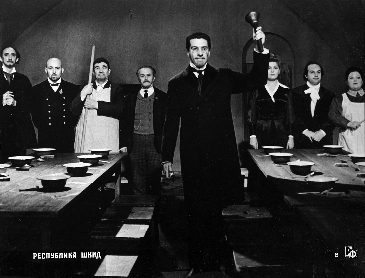 В театре он сыграл Тузенбаха в «Трех сестрах» — некрасивого барона, мечтателя, свято убежденного, что через двести — триста лет жизнь будет прекрасна. Тузенбах погиб нелепо на дуэли, его мечты о труде, его поездка на кирпичный завод — всему этому не дано было осуществиться. Когда Юрский появляется в кадрах фильма «Республика Шкид» в роли Викниксора, мгновенно рождается мысль — это Тузенбах! Разумеется, это совсем не он, но и он тоже, даже внешне, совсем как Тузенбах в последнем действии, когда он снял мундир, явился в штатском. Длиннополый сюртук, пенсне, благородная выправка, высокий белоснежный воротник — облик Викниксора в первый момент кажется странным, несколько даже театральным в момент всеобщей разрухи, голода, в окружении орущих, грязных, буйствующих беспризорников.