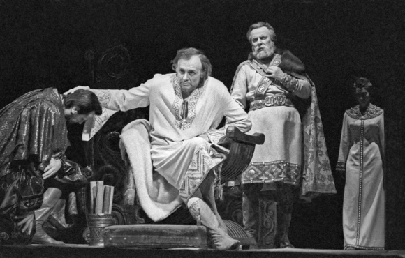 Мы видим лицо изможденное и немолодое, спутанные, бесцветные волосы, лицо царя Федора некрасиво, ибо это образ чистой духовности, где все, кроме напряженного, испытующего взгляда, оказывается как будто стертым. Любое появление царя Федора в спектакле мгновенно сосредоточивает на нем зрительное внимание; свет, который от него падает на остальных участников трагедии, есть свет его разума.