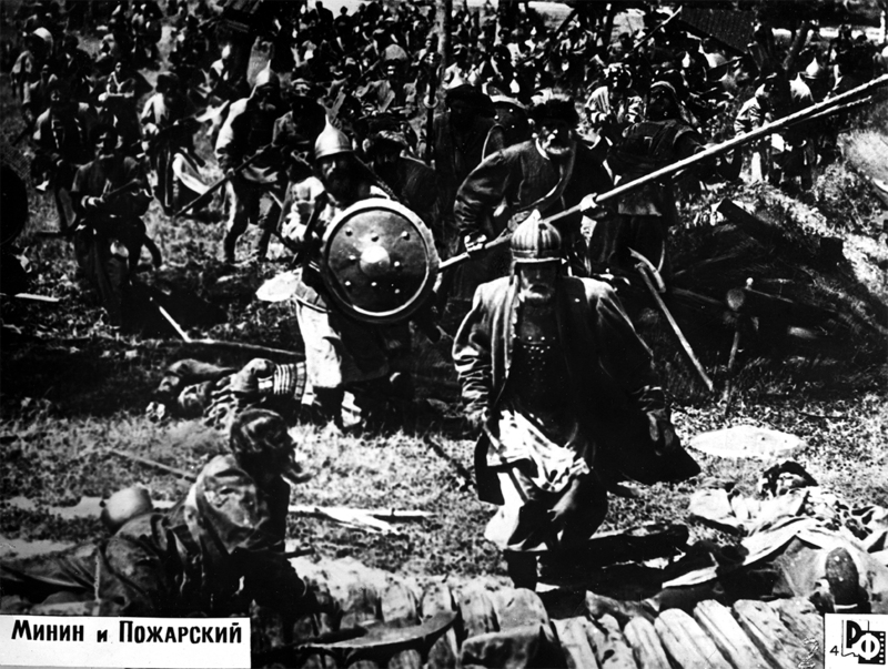 У Шкловского и Пудовкина были неприязненные личные отношения. Сходились они, пожалуй, в одном: в утверждении своего метода как… «реалистического». То, что Шкловский называл «историческим реализмом», Пудовкин характеризовал следующим образом: «Здесь все должно быть создано воображением. В этот воображаемый мир нужно было глубоко врасти, поверить в него, почувствовать себя в нем свободным». Это Пудовкин называл «художественной правдой». В соответствии с ней фильм открывался словами, в которых крестьянские восстания и Смута даже не упоминались: «Шесть лет страдала русская земля под гнетом интервенции…» Причина всех бед — раздробленность. «Кабы собрать всех русских людей…» — мечтательно говорит Минин, глядя на царящие кругом разруху и голод. Мешают объединению индивидуализм и собственничество.