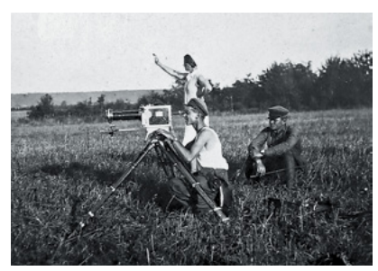 В 1937–1938 годах я снимал с Анци-Половским художественный военно-приключенческий фильм «Неустрашимые». В нем было много съемок в воздухе, с самолета. Надо было снять летящий рядом самолет и события, происходящие в нем. Средние и крупные планы еще можно было снимать на земле, но общие планы, когда должен был быть виден весь самолет, требовали съемок в воздухе. Пробный полет показал трудности таких съемок. Самолеты «Р‑5», с которыми мы работали, не были закрытыми, как современные. Причем если летчик сидел так, что выше фюзеляжа выступала только его голова, то стрелок, на месте которого должен был находиться я, был прикрыт бортом только по пояс. Скорость самолета — около пятидесяти метров в секунду, следовательно, встречный поток воздуха будет вдвое сильнее земного урагана, валящего деревья.