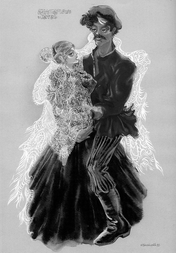 Перебираем молча рисунки. Портреты коллег. Необычные, очень красивые, прямо декоративные. Очень похожие (на тех, кого изображают, конечно, а не на друг друга!). Вот во фраке и цилиндре актер, который великолепно танцует, поет, острит. Небрежная поза фата и лицо философа. Очень хороший актер. Он не виноват, что все от него непременно ждут песен, танцев и острот. Но веселого тут мало, и он невесел. Вот с пером, пером за ухом другой актер чьи злые кусачие эпиграммы на коллег и знакомых тут же превращаются в фольклор, передаваясь из уст в уста. Умный проницательный взгляд. Мефистофельски заострены черты, а общее выражение тем не менее доброе и усталое. Такой добрый усталый Мефистофель. Капельку разочарованный в себе самом. А рядом — внезапно экспрессивные, яростные, стремительные композиции - фантазии на темы любимых пьес, спектаклей, фильмов.