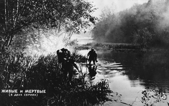 Олоновский снял фильм подчеркнуто сдержанно, с почти пуританской простотой, умело оперируя движением камеры и ни на минуту не выпуская, выдвигая на первый план актера, его лицо, его глаза. Организуя кадр, художник Ст. Волков порой, на мой взгляд, приближается к кинохронике тех лет, но вместе с тем каждая деталь фильма строго продумана. Мы решили снимать фильм «Живые и мертвые» без музыки — нам казалось, что музыка нарушит правдивость происходящего на экране, внесет определенную условность. ‹…›