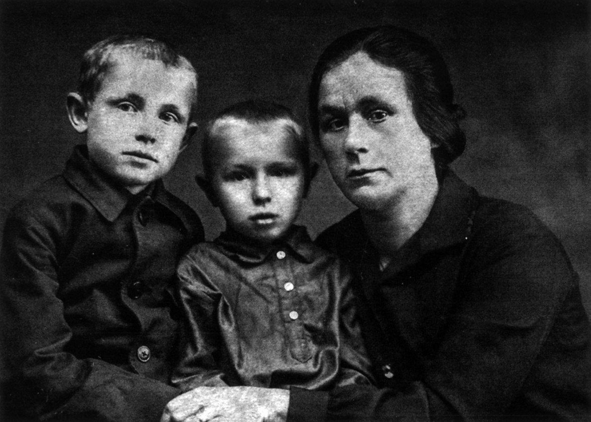 Это (показывает) мой младший брат. Есть еще средний брат — Аркашка, но он где-то там, на другой фотографии, с матерью; такой очень белый, одутловатый — любимец всей семьи. Меня мать не любила, к сожалению. Но это не мешало мне любить ее. Вот еще портрет мамы. Она была человеком забитым, верным отцу, очень работящая… Прекрасный человек, но характер у нее был довольно жесткий. Почему-то она меня не любила — всю свою нежность, сердечность и заботу она отдавала моему среднему брату. А я с младшим братом Володей воспитывался у тети Нади.