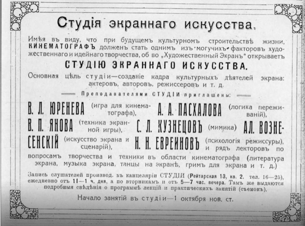 В прессе сообщалось, что слушатели Студии будут посещать не только постоянные занятия, но и лекции известных деятелей искусства, в том числе Ал. Бенуа, Н. Н. Евреинова, А. Р. Кугеля, В. Л. Юреневой и др. представителей театра и литературы: «На приглашение директора студии А. С. Вознесенского приехать в Петроград для собеседования со слушателями по вопросам экрана ответили согласием почти все виднейшие представители московского экрана»[64]. В этой Студии прочел свою программную лекцию о кинематографе и о фильме «Портрет Дориана Грея» (1915) В.Э. Мейерхольд[65]. Серьезной проблемой стало то, что желающих учиться в Студии оказалось больше, чем можно было предположить, причем далеко не все потенциальные студенты подходили к делу сознательно.