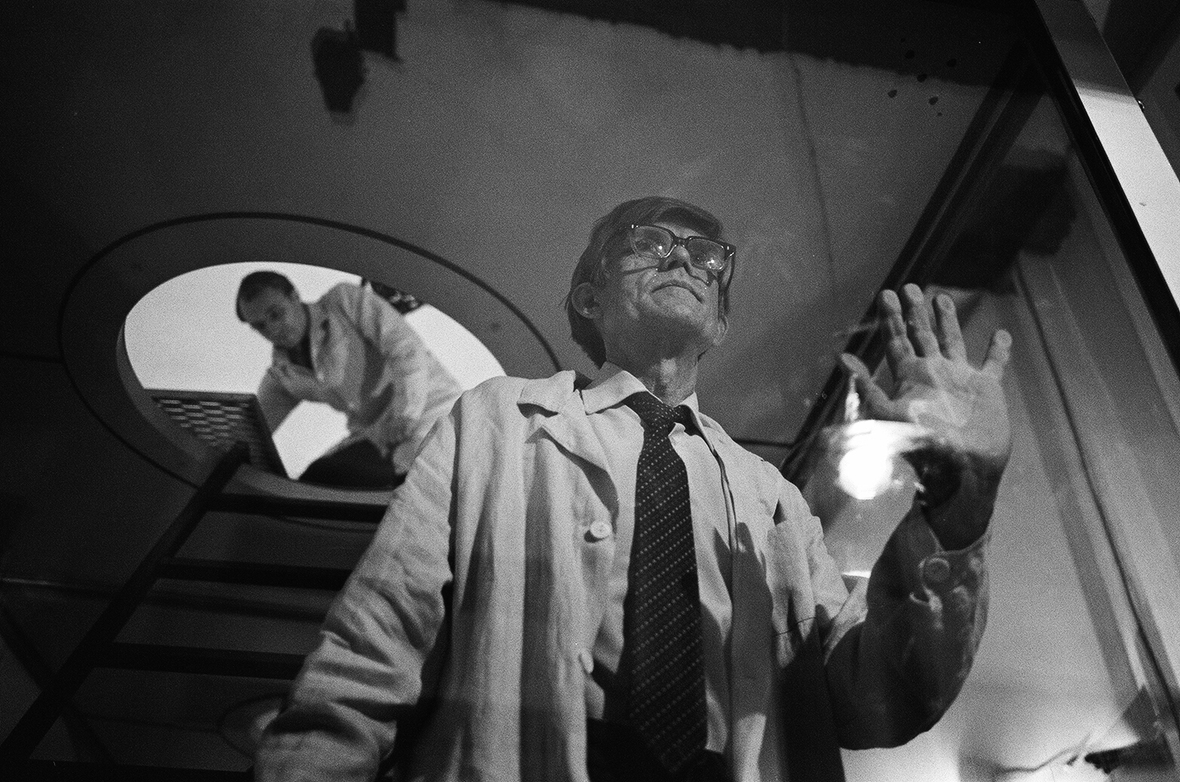 Когда директор (Института) в погонах Ажиппо вызывает после оргии завкадрами Палыча, чтобы его наказать, этот невозможный в реальности службист, не помнящий имена своих кадров (тут уместно вспомнить мейерхольдовскую трактовку гротеска как сверхточность), берет вину на себя. Мелькнувшая тень процессов над вредителями, убежденными, что признания облегчат их участь, сочетается с достоинством этого хама. Директор, генерал КГБ, решает сменить тактику, отправить завкадрами на пенсию с почетом. Палыч без всякой актерской пристройки, «оценки» принимает подарок судьбы не как благодарный смерд, а как право имеющий. Тонкая игра. И между партнерами, и каждого из этих актеров. Выходя из директорского кабинета, бывший завкадрами не может в лабиринте зеркальных дверей найти выход и пугается. Секунды неокончательного «окончательного решения вопроса» нагнетают саспенс. А он рождает образ внутреннего устройства не только этого психического типа, но всего игрового пространства Института, страны, социума.
