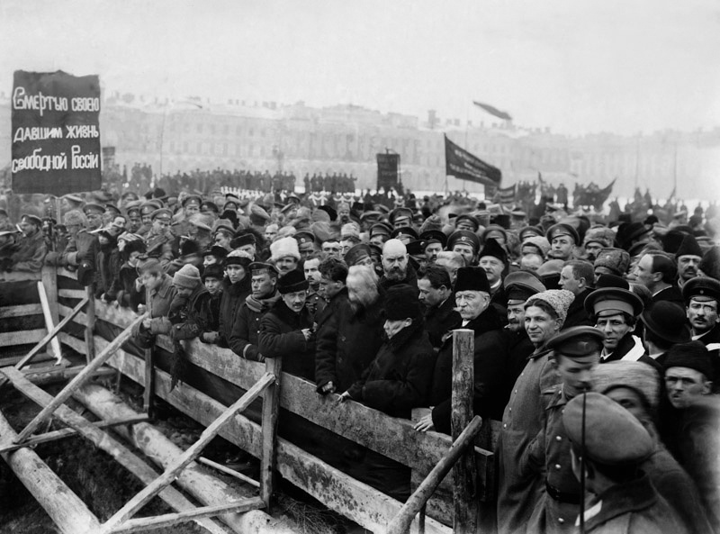 В Петрограде ситуация была трагичней. 23 марта на Марсовом поле прошли похороны жертв революции. Пострадало более 1200 человек, куда, наверное, не включили убитых солдат и полицейских. По некоторым подсчетам, в траурном шествии приняли участие до миллиона человек. Это первые в России похороны, совершенные не по религиозному обряду. Событие снимало множество операторов. По данным сотрудницы фотоотдела Красногорского архива Марины Чертилиной, в архиве храниться 12 сюжетов посвященных этим событиям.