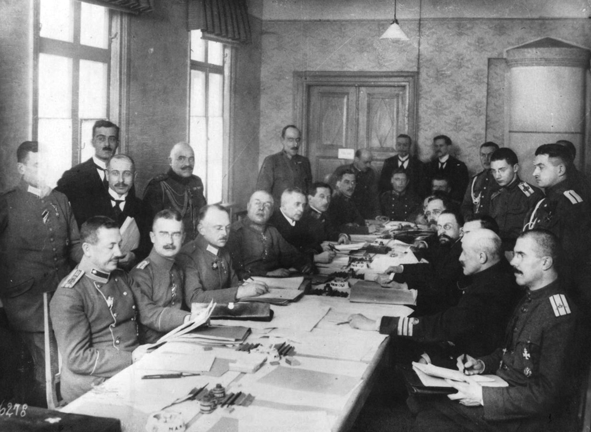 Второй состав экспертов, приехавших на переговоры, запечатлен полностью: это адмирал Альтфатер, генерал-майор Самойло, капитан Липский, полковник Фокке. В кадрах есть австрийская и германская делегации, представители Турции и Болгарии. Есть и кадры прибытия на второй этап переговоров Троцкого. Что интересно, хроника в Госфильмофонде сохранилась с белорусскими субтитрами. Возможно, она демонстрировалась на территории так называемого Обер-Оста — части Белоруссии под военным управлением Германии. Долгое время кадры переговоров в Брест-Литовске считались первыми в истории съемками подписания мирного договора.