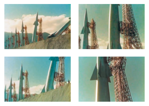 Декорацию не сдвинешь, макет тоже лучше не трогать, и совмещение достигается перемещением съемочного аппарата влево-вправо и вверх-вниз. Перемещения эти составляют сантиметры, а часто и миллиметры, поэтому о перестановках штатива не может идти и речи. На штатив ставится особая головка, которая вращением ручек позволяет чуть двигать аппарат в стороны и по высоте. Есть еще одно требование, которое очень осложняет конструкцию этой головки. Дело в том, что после достижения совмещения может понадобиться немного изменить композицию кадра, повернуть аппарат чуть в сторону или изменить его наклон. Штативная головка, конечно, позволяет это делать, но при этом объектив уходит с нужной точки и совмещение сразу нарушается. Поэтому головка должна еще обладать и возможностью поворачивать аппарат вокруг центра объектива, то есть должна иметь отдельную систему поворотов и наклонов. В целом головка — довольно сложное и тяжелое сооружение, которое ставится на штатив, а на него ставится аппарат. Первое время мы кустарничали, сооружая головку из имеющихся механизмов, но потом сделали свою собственную конструкцию, с которой успешно работали. Я много говорю о комбинированных съемках, так как именно они в значительной степени определили успех фильма.