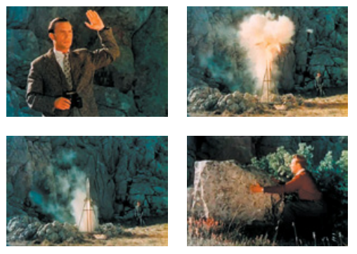 Мы, к примеру, первыми начали снимать взлеты ракет, применяя огромные П-образные фермы — «виселицы», выходившие за границы кадра, с двумя блоками наверху. Ракета подвешивалась в центре фермы на двух тонких, невидимых на фоне неба, струнах, с противовесом у края фермы. Противовес был чуть легче ракеты, когда она заряжена пиротехническими патронами. При включении пиротехники из хвоста ракеты вырывалась струя огня и газа. Ракета становилась легче, противовес ее перевешивал, и она плавно отрывалась от стартового стола и, ускоряя движение, устремлялась вверх. Чтобы ракета не разбилась о перекладину фермы, противовес был снабжен амортизатором из пучка обычной бельевой резинки. Этой системой «запуска ракет» мы потом многократно пользовались при съемках всех моих космических картин. Был только один случай сбоя на съемках фильма «Луна», но о нем я расскажу, когда буду писать об этой картине. Имитации невесомости мы добивались двумя способами. Первый из них можно назвать вертикальной съемкой.
