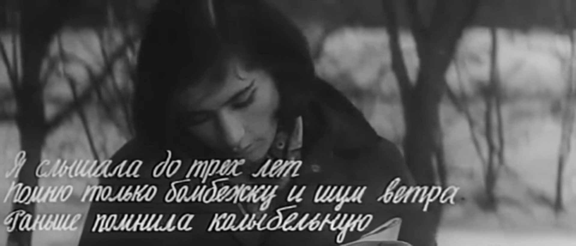 <...> Отношения между двумя главными героями демонстрируют сходную сложность. Очевидное влечение между Наташей и Серёжей подрывается разделением между глухим и слышащим мирами, подчёркнутым режиссурой Богина. В пространстве слышащих Наташа молчалива и сдержанна, не в состоянии выразить себя ни Серёже, ни его друзьям. Камера часто воспроизводит её взгляд, когда она пытается читать по губам или почувствовать музыку, а звуковая дорожка заменяется диссонирующим шумом или тишиной. Такая немота Наташи выглядит тем более удивительной, что, несмотря на социальный акцент на жестовом языке, именно устная речь находилась в центре советского образования глухих, и маловероятно, чтобы человек вроде Наташи вовсе не умел говорить, <...> молчание является характерной чертой маргинального или субалтерного субъекта, особенно женского, и в этом смысле подчёркивает врождённую инаковость Наташи в контексте фильма. Серёжа, напротив, показан разговорчивым, но при этом не способным проникнуть за стены глухого пространства: в показательной сцене он приходит навестить Наташу у неё дома, но не решается постучать в дверь, отмеченную наклейкой «глухие». <...> В финальных сценах фильма оба персонажа улыбаются и идут по парку порознь; движутся ли они навстречу друг другу или в противоположные стороны, остаётся неясным.