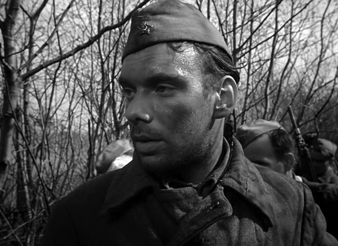 В картине не изображены бои, мы лишь однажды видим Бориса, пробивающегося сквозь болота из окружения. Но и в этой ситуации он показан через отношение к Веронике: ударом валит он в грязь своего напарника, посмевшего оскорбить девушку нехорошим намеком. А через несколько минут они пойдут вместе в разведку, тот солдат будет ранен, и Борис будет тащить его на себе, пока сам не будет убит.