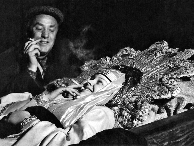 В прежние времена можно было купить такие иконы, где к лику святых были привинчены покрашенные позолотой жестяные нимбы. Позолоченную жесть складывали в гармошку и выкладывали полукругом, как чепец, и из этого нимба выглядывало нарисованное лицо. Именно так выглядывает лицо Людмилы Целиковской из-под кокошников, кос и убранств царицы в «Иване Грозном» (1944) Эйзенштейна. Глаза лучатся, кожа светится теплотой — но пыльный позолоченный нимб намертво привинтил ее к доске. Весь фильм Эйзенштейна, по сути, такая пыльная доска с позолоченным нимбом для облика Целиковской: нарочитые позы из арсенала немого кино, кривые взгляды, перекособоченная архитектура борьбы за власть. И только солнышко царицы согревает, наставляет Ивана на неподъемную борьбу. Большего она дать не может — ей не сдвинуться. И огромную сцену она играет вовсе в гробу, присутствуя на протяжении важных 15-ти минут в качестве трупа. После этого правая борьба Ивана превратится в сведение счетов, паранойя станет уделом такого красивого в первой серии (пока была жива героиня Целиковской) царя.
