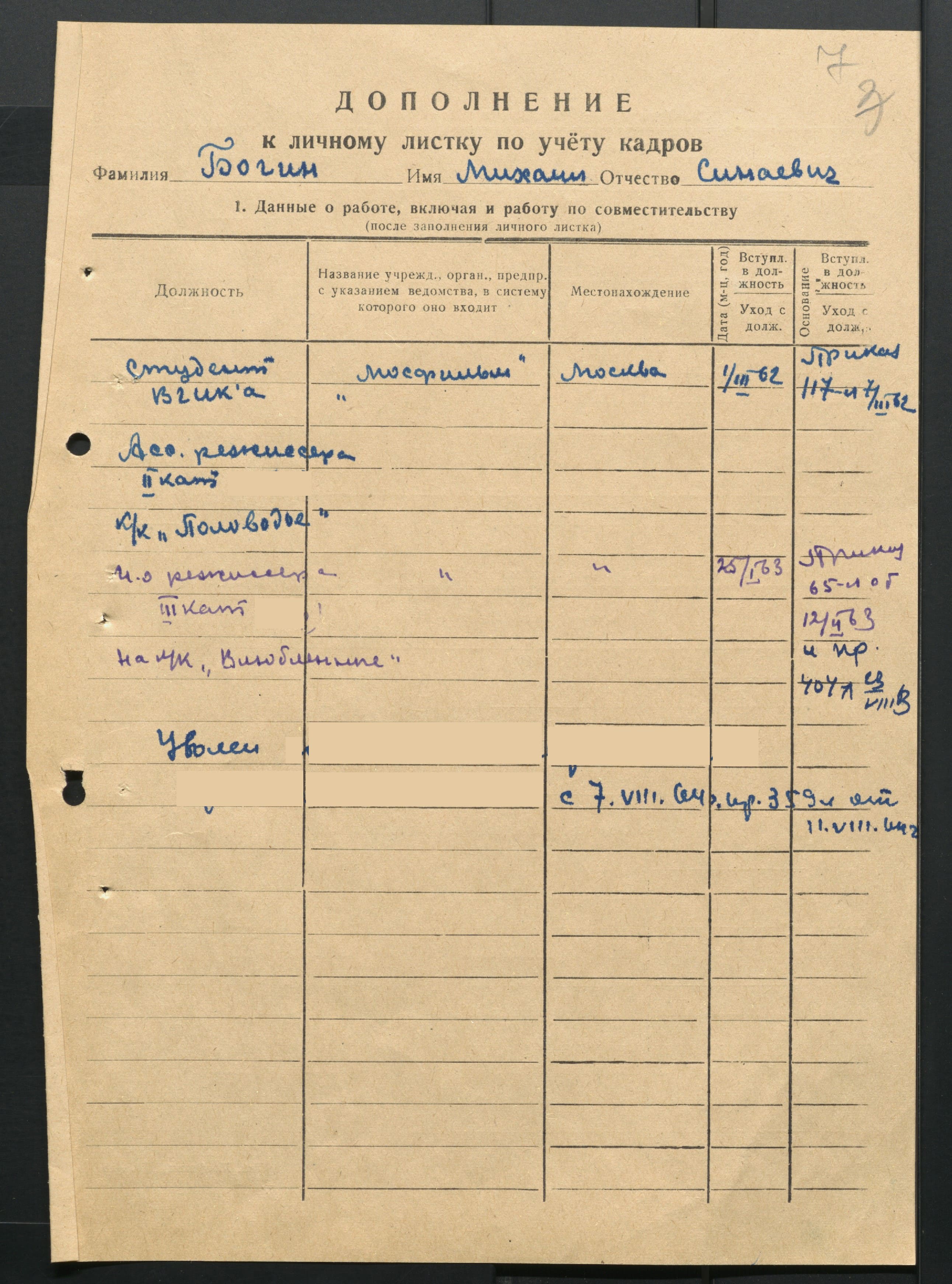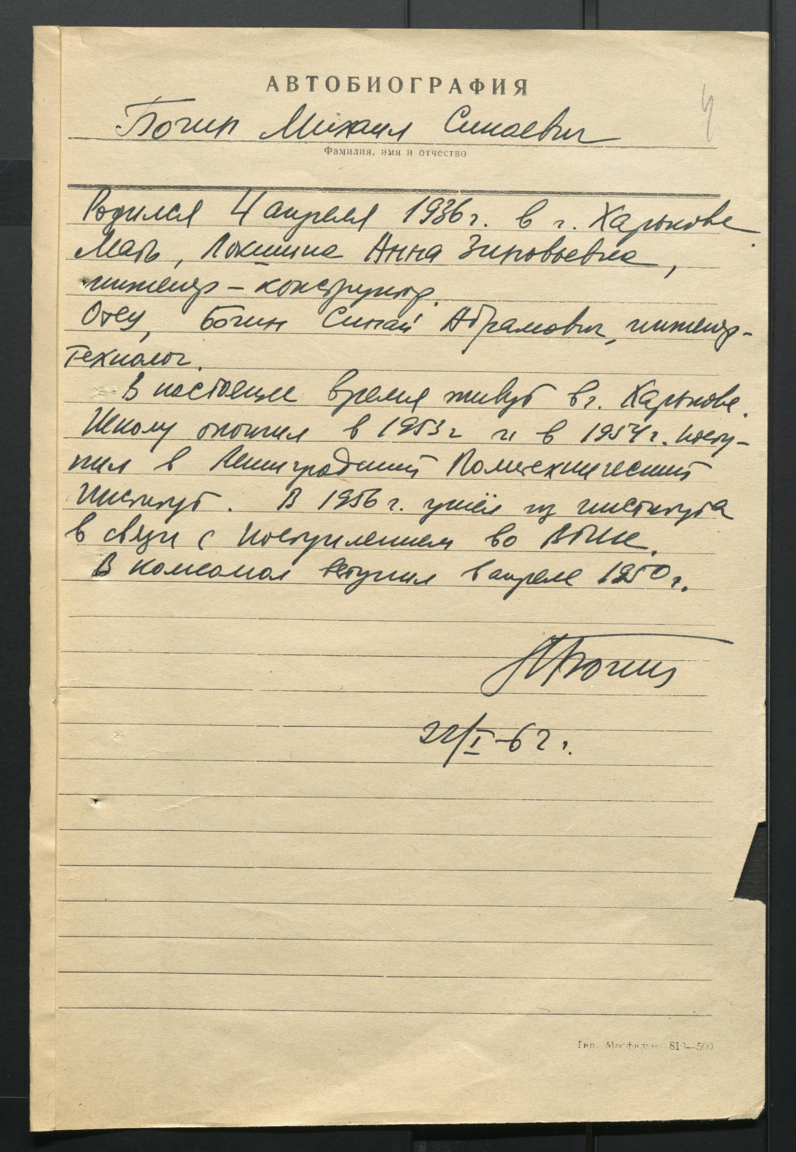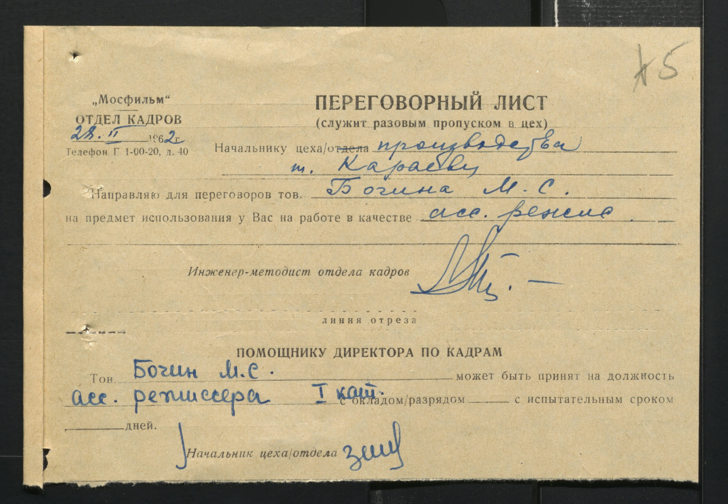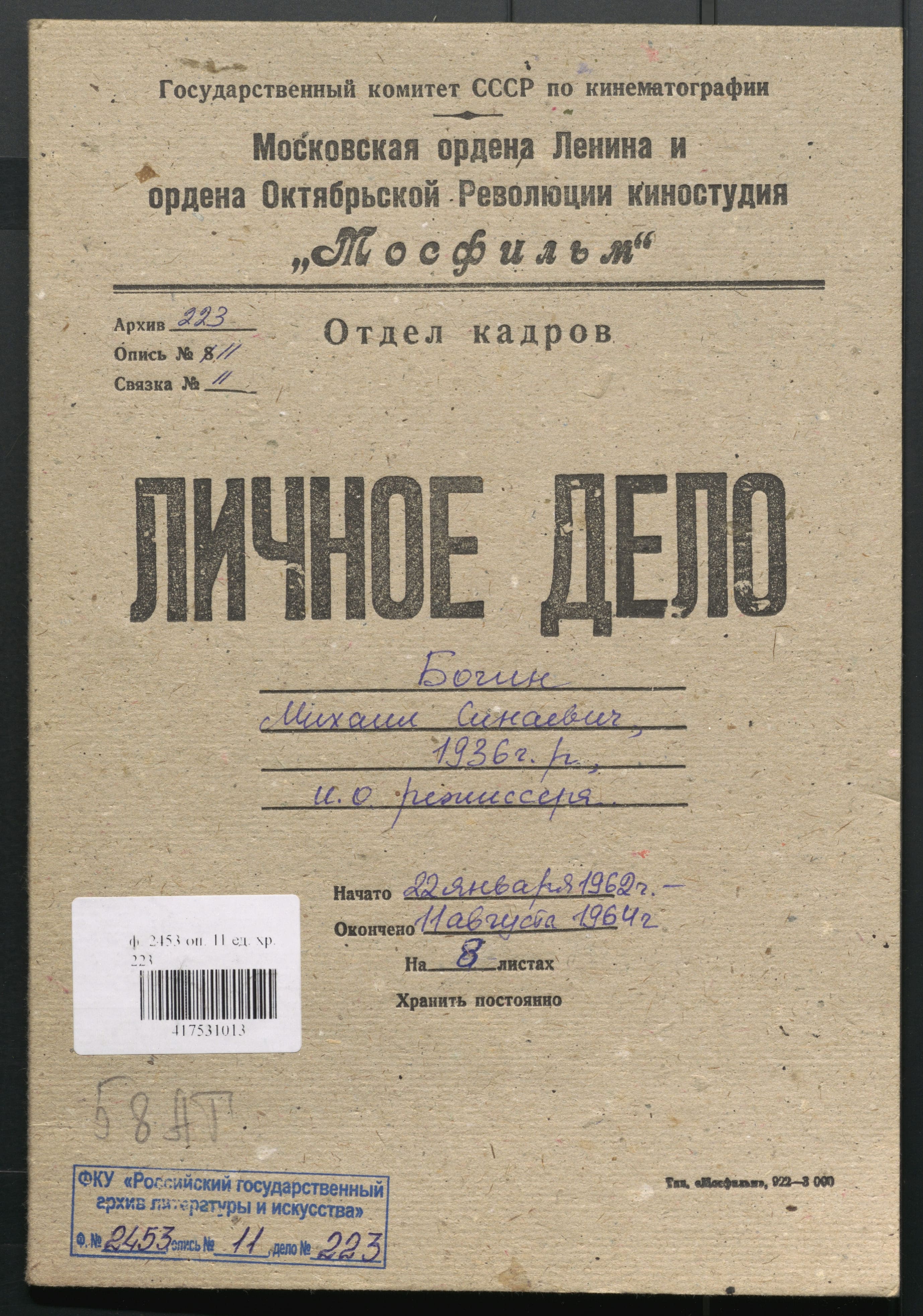 ФКУ «Российский государственный архив литературы и искусства». — Ф. 2453, оп. 11, д. 223. // Государственный комитет СССР по кинематографии. Московская ордена Ленина и ордена Октябрьской Революции киностудия. Архив [...] Личное дело режиссёра Михаила Богина.