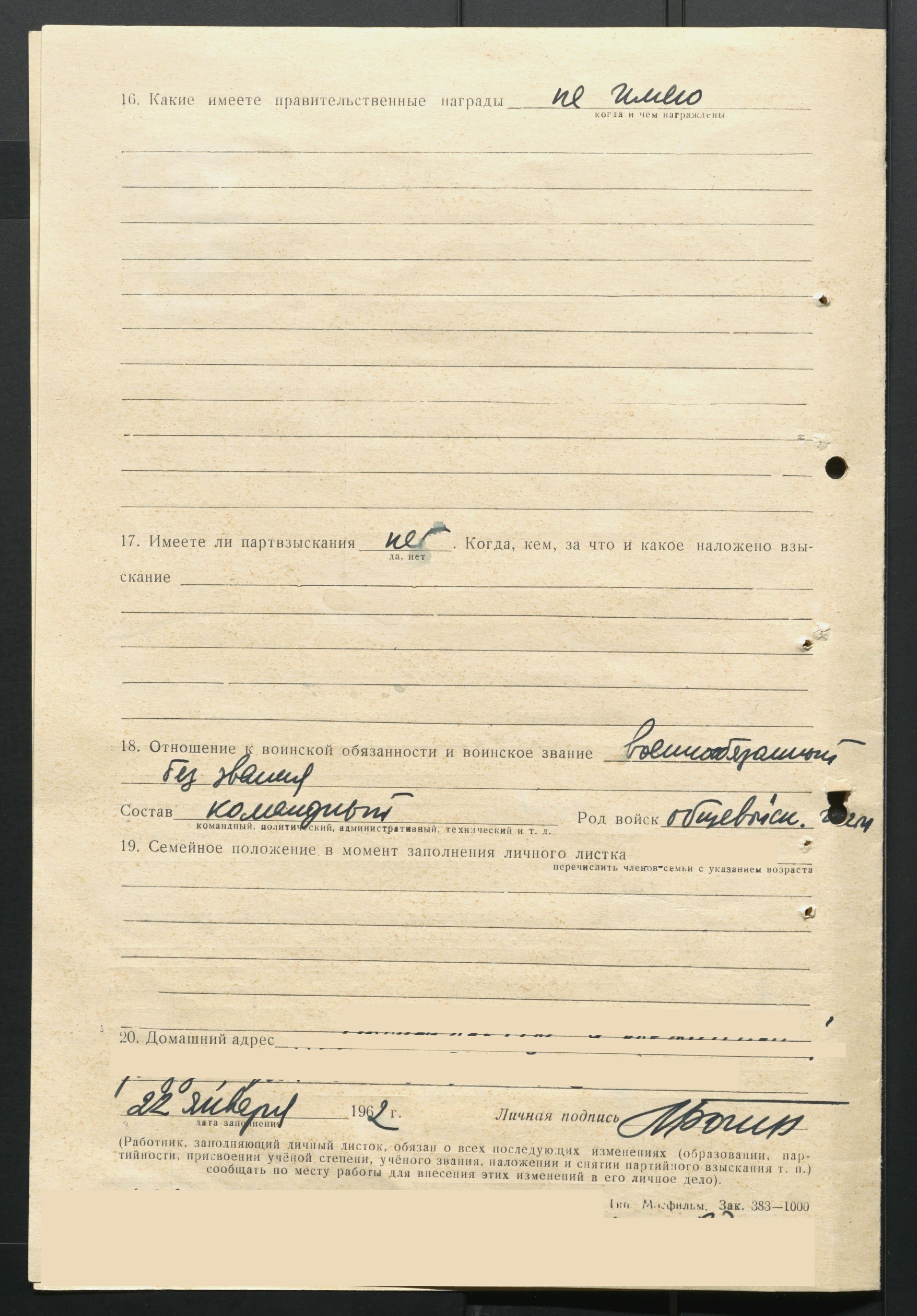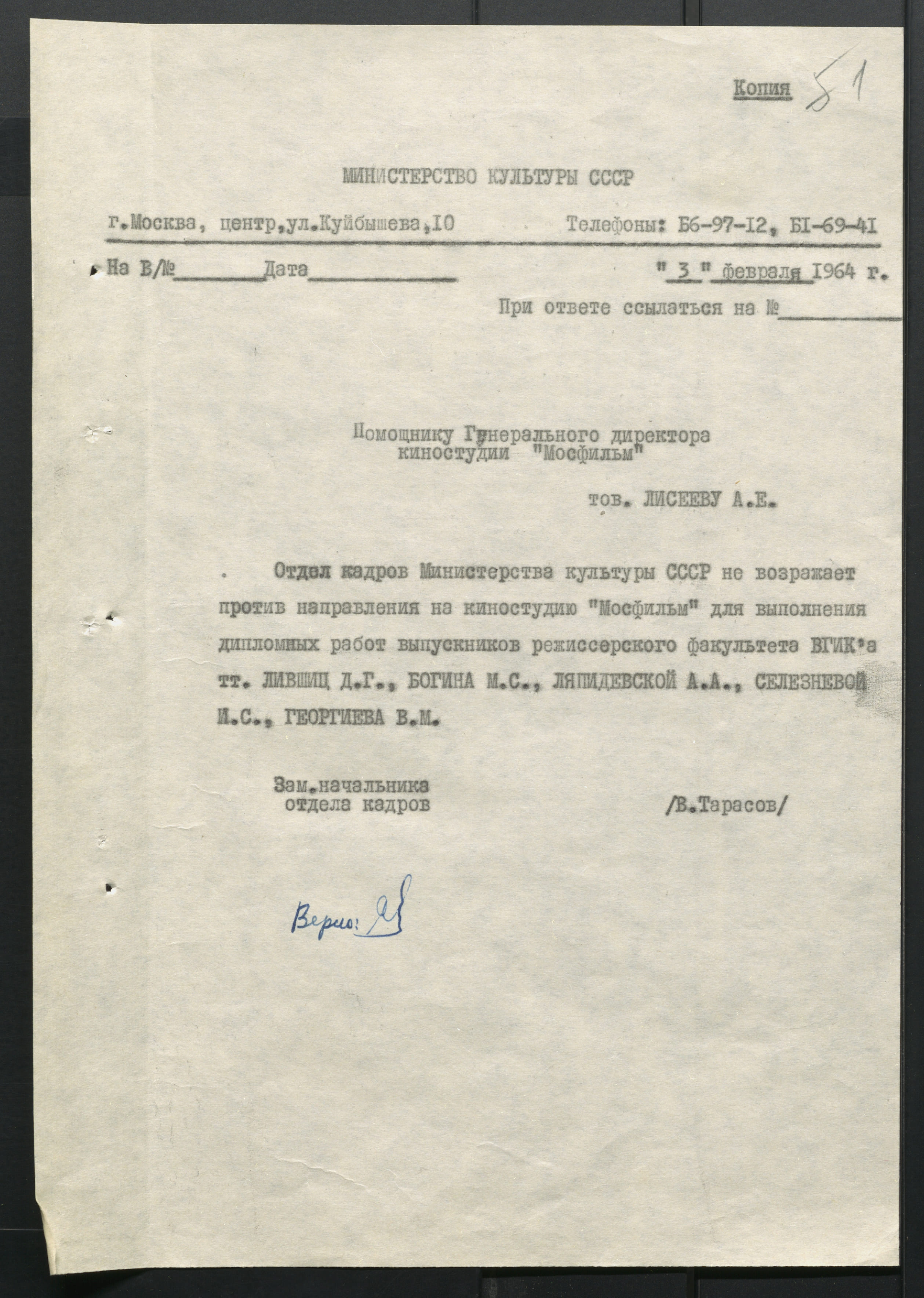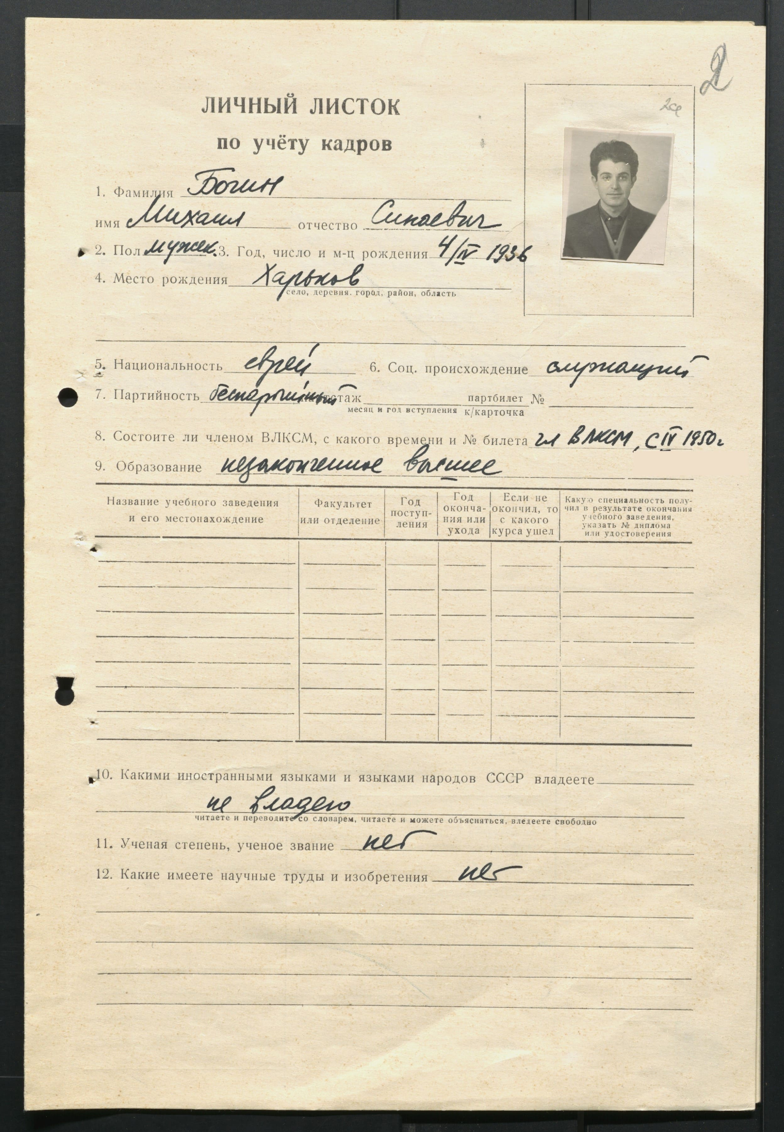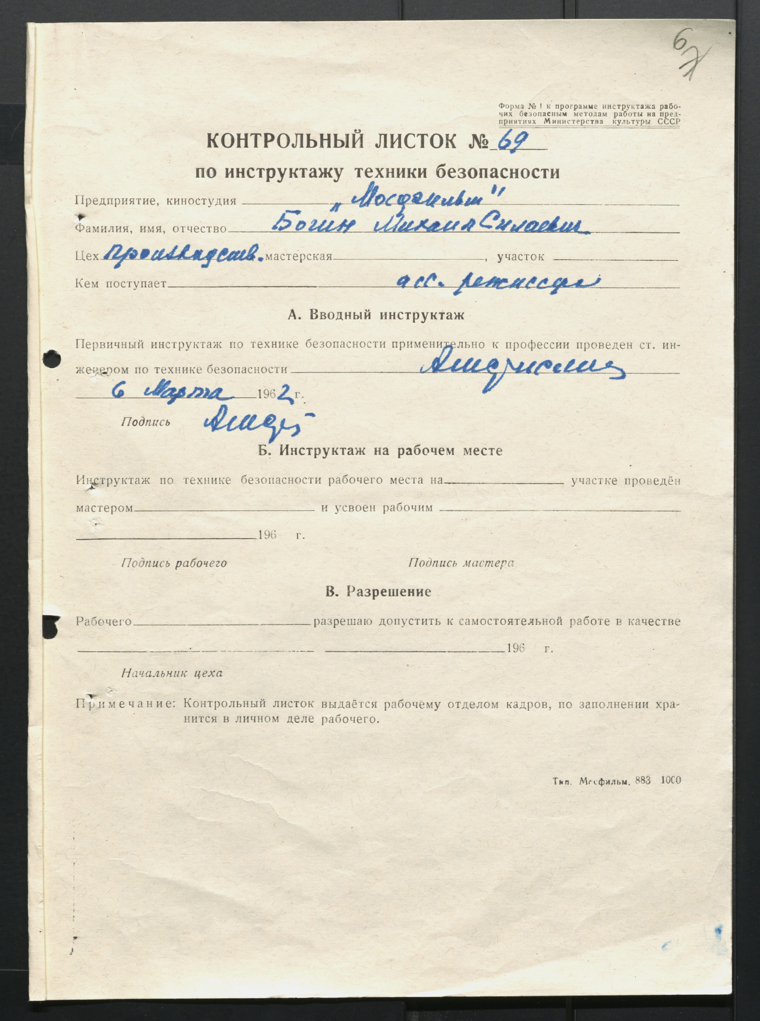 ФКУ «Российский государственный архив литературы и искусства». — Ф. 2453, оп. 11, д. 223. // Государственный комитет СССР по кинематографии. Московская ордена Ленина и ордена Октябрьской Революции киностудия. Архив [...] Личное дело режиссёра Михаила Богина.