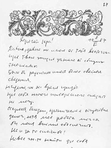 Дорогой Юра! Давно не имею от тебя весточки. От общих друзей узнаю о твоем житье-бытье. В нашем возрасте факт физического существования – радостен, казалось бы все иное вторично. Но все же… Если сможешь напиши мне письмо. Это всегда мне волнительно. Давно не слушал тебя в концертах – это обидно. У меня все по-старому. <… > Материально – паршиво. Основу моего бюджета за 40 лет составляло кино. Теперь почти никто не нуждается в сотрудничестве со мною. Я понимаю, что сейчас требуется совсем другая музыка для фильмов и в действительности есть целый ряд замечательных молодых, и полумолодых композиторов успешно работающих и преуспевающих в этом жанре. Но все же когда я вижу на экране конницу Буденного под звуки электрогитар, синтезаторов и ритмов «дикого Запада» – мне становится странно и дико. Хотя о вкусах не спорят. За год прошедший после выхода моего из больницы я написал две симфонии (17-ю и 18-ю). Они о войне отечественной, о чем-нибудь другом мне все труднее и труднее писать. 18-я с хором на стихи С. Орлова, А. Твардовского и военные, народные стихи. 17-ю исполнил на «Московской осени», как всегда блестяще В. И. Федосеев. 18 тоже обещал исполнить. Вероятно, в этом году выйдет из печати в «Советском композиторе» клавир «Портрета». Мечтаю его тебе подарить. Как ты догадываешься издательство «Музичка» для меня закрыто. Вновь избранное руководство секретариата С. К. РСФСР выгнало меня из закупочной и приемной комиссии, где я проработал 15 лет, жертвуя своим временем, здоровьем и волей-неволей наживая врагов. Чем был продиктован этот акт остракизма – не знаю. Вот такие дела. Напиши, как твоя работа двигается. Какие новые встречи с твоей музыкой нас ожидает. Прочел в газете, что снимается фильм «Георгий Свиридов». Дай Бог посмотреть мне. На днях умер Абрам Лобковский14. Целую тебя. Сердечный привет Эльзе.