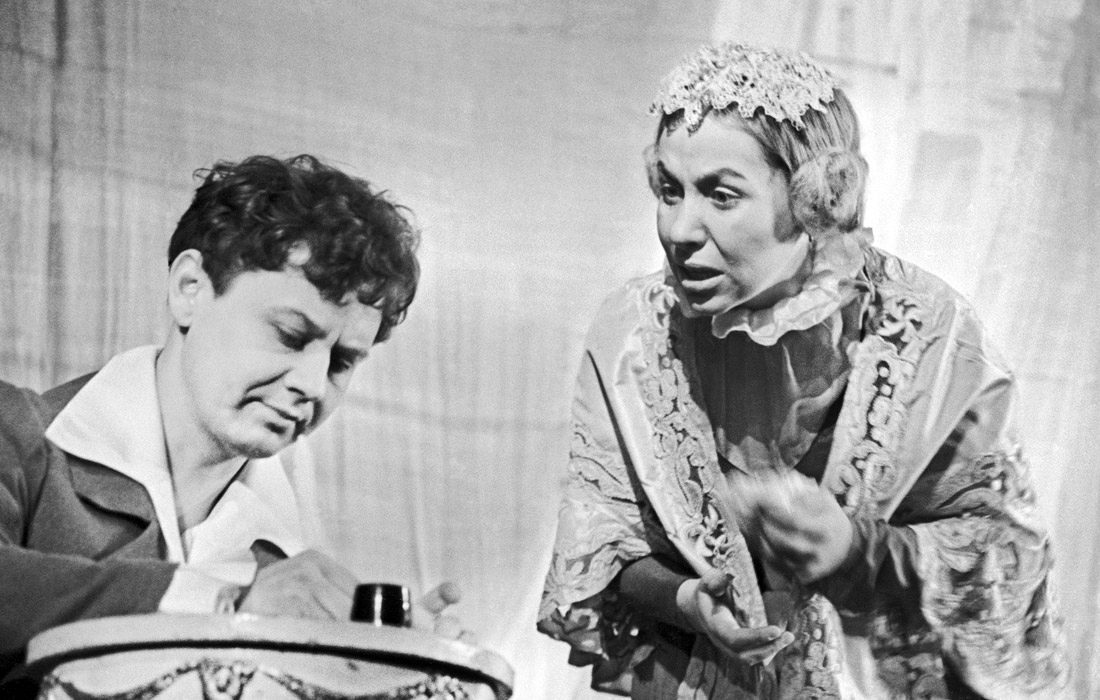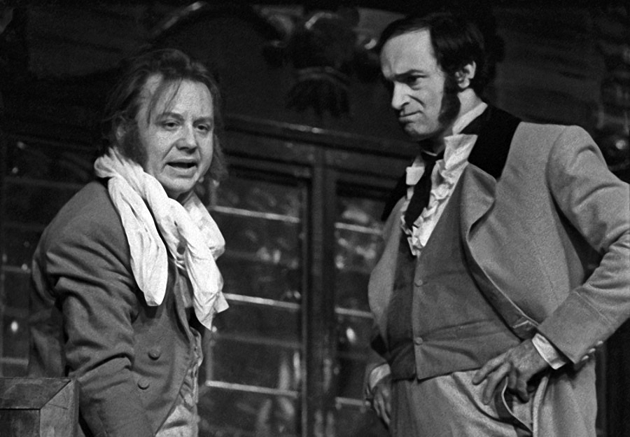 Тот же Олег Табаков играл теперь Балалайкина — живое олицетворение стяжательской алчности, хамелеонской лживости и самого бессмысленного пустословия, — фигуру, родственную другим «благонамеренным скотинам» вроде звероподобного квартального надзирателя Ивана Тимофеевича, чью торжественную монументальность картинно показывал П. Щербаков, или многозначительного словоблуда Глумова, представшего перед нами в саркастическом актерском рисунке В. Гафта...