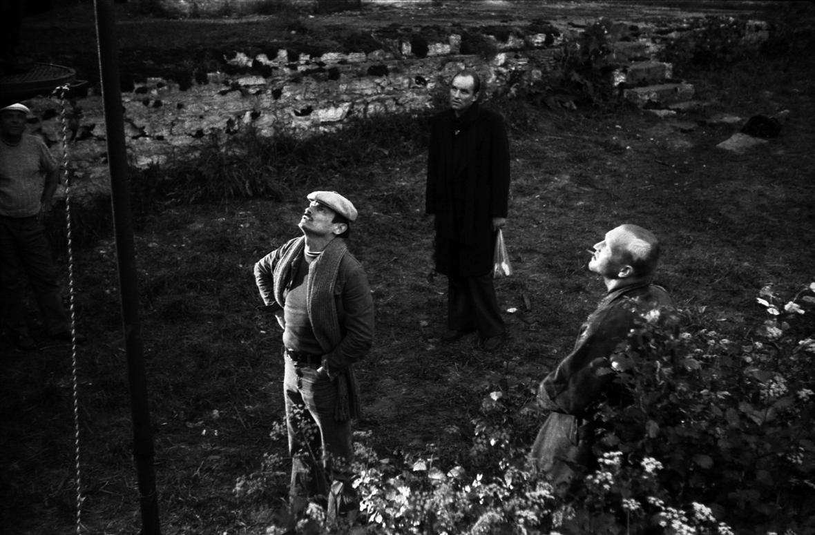 Репетировали его два дня. Снимали в вечерний режим, когда нужное состояние света занимает 20-25 минут. Первые два дубля не устроили Тарковского. Снимаем третий дубль: Сталкер бьет Профессора, но от удара кепка слетает с головы, падет в дырку в полу и исчезает в подземелье. И тут выясняется, что кепка в единственном экземпляре и найти замену невозможно. Бригадир осветителей направил в дыру мощный прибор. Внизу было