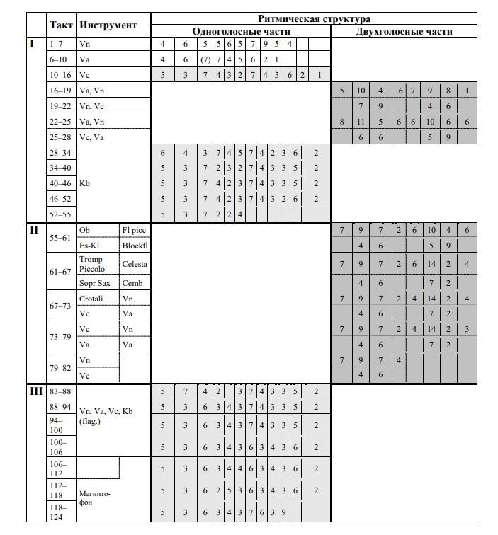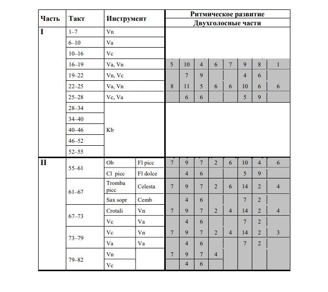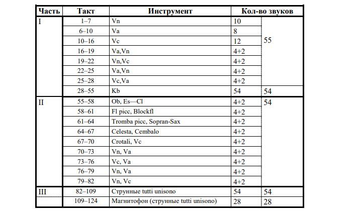 Такое тембровое решение можно интерпретировать, вероятно, как „выход в другое измерение“. Вся композиция оказывается обрамленной тембром струнных, в то время как духовые и ударные инструменты лаконично проходят в её центре, образуя «золотую середину». Схематически порядок вступления инструментов и количество звуков в каждом из них можно представить следующим образом:
