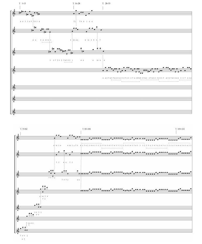 Музыкальное развитие представлено исключительно в высоком регистре. На протяжении всей композиции между соседними звуками возникают следующие квинтовые созвучия, схематически представленные гармонически. Нижестоящие числа указывают на соответствующий раздел в форме.