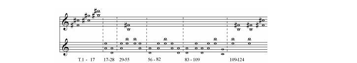 В этом числовом ряду можно обнаружить две симметричные части по 12 звуков в каждой (не учитывая реприз). Помимо того, в них располагаются небольшие симметричные ячейки. В первой части центром симметрии оказывается число 7, во второй части отражение элементов происходит относительно числа 1. В "точке золотого сечения" находится квинта C — G (порядковый номер 4): при общем количестве тактов (124) это созвучие появляется в т. 109. Закономерности обертонового ряда проявляются уже в первых тактах композиции, где последовательно утверждаются два основных начальных интервала: октавы и квинты (Fis-Cis, Cis-Gis). Необычность этого ряда в том, что его исходные звуки расположены в четвёртой октаве!