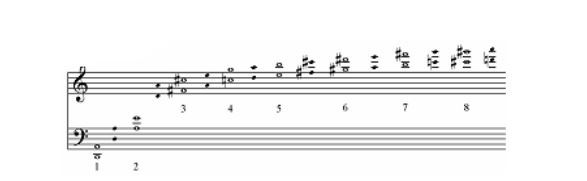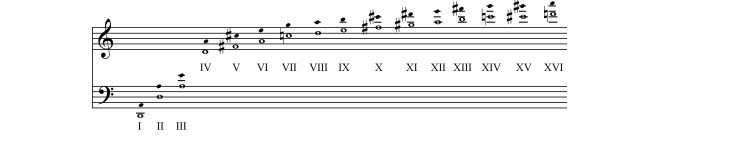 Первая квинта (D — A) представлена в данном раду пять раз: как первый, второй, четвертый, восьмой и шестнадцатый обертоны. Вторая квинта (A — E) повторена лишь три раза: третий, шестой и двенадцатый обертоны. Третья и четвертая квинты появляются лишь дважды: пятый и десятый обертоны артикулируют Fis-Cis, седьмой и четырнадцатый повторяют C — G. Остальные квинтовые созвучия экспонируются только один раз. Закрепив данные порядковые номера за соответствующими квинтами, мы представим развитие этой спектральной композиции следующим образом.