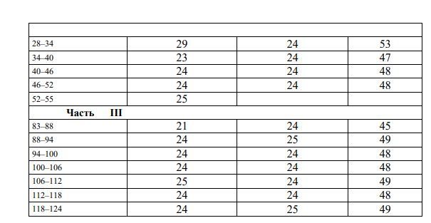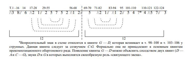 В контрапунктических частях данный ряд поделен, как правило, на два равных сегмента по шесть тонов в каждом. Развитие ритмических последовательностей в двухголосных разделах ДА можно отразить следующим образом: