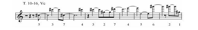 Следует заметить, что "оригинальный ряд" (т. 10–16) подвергается в т. 28 частым отклонениям и перестановкам. Тем не менее, последовательное (хотя и вариативное) проведение данного ритмического ряда свидетельствует о его константности, поскольку исключения лишь подтверждают правило.
